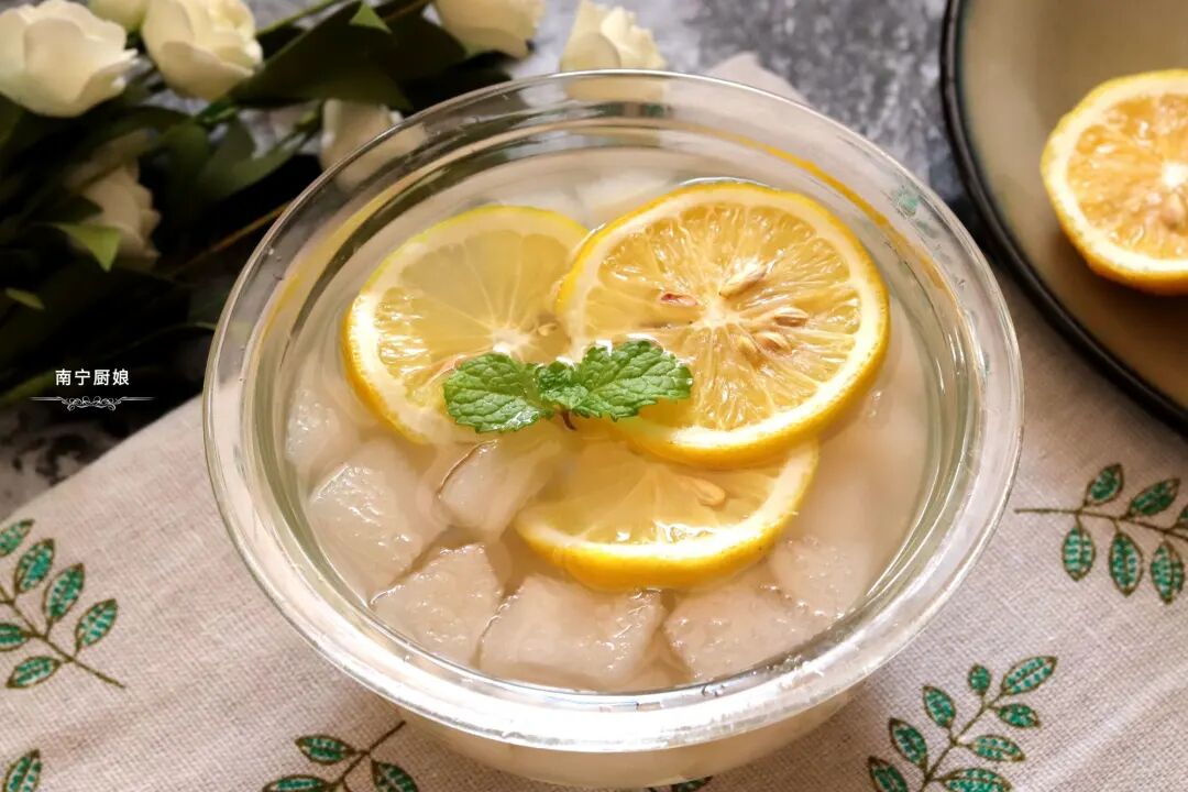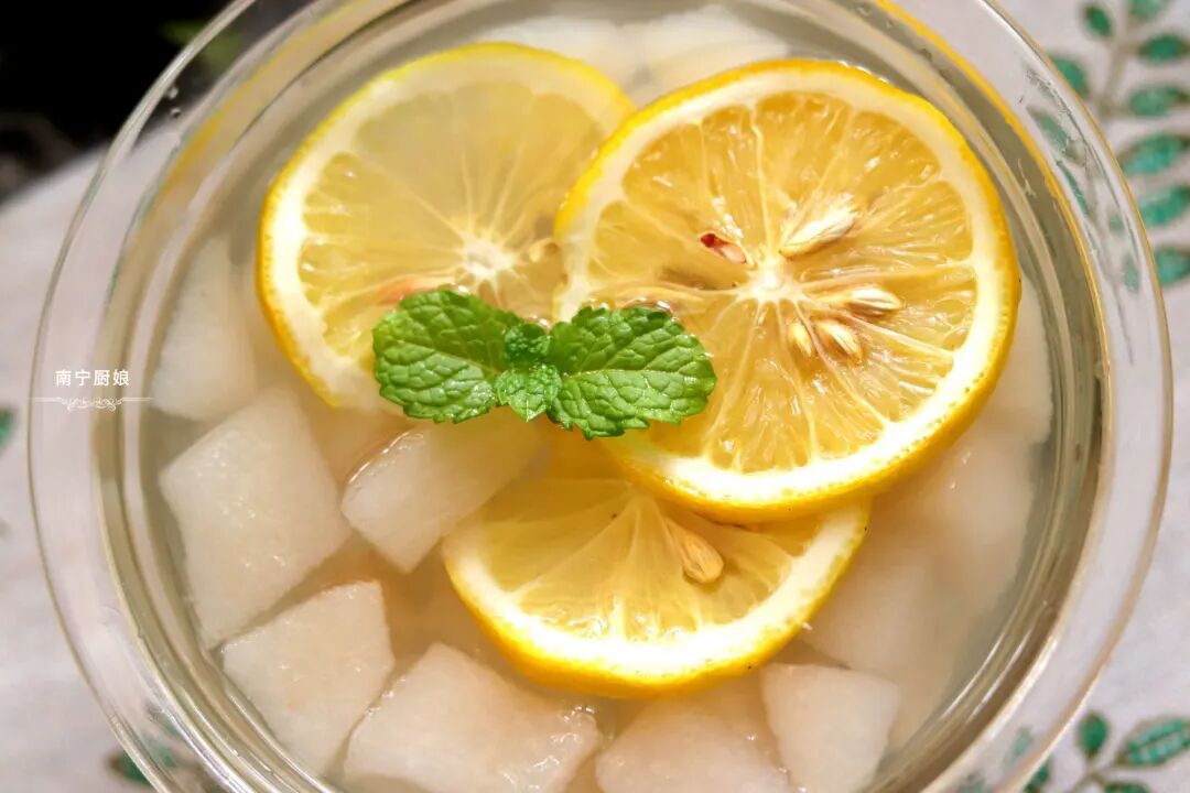 出锅后,放入柠檬片,再放上薄荷点缀即可!(薄荷可放可不放,只是我拍照好看放的),一碗做法简单又实用的柠檬雪梨糖水就做好啦!糖水有柠檬的加入变得酸甜可口,多喝可下火、润肺哦!