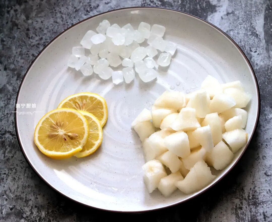 准备好食材:雪梨1个、冰糖30克、柠檬3片、矿泉水2杯