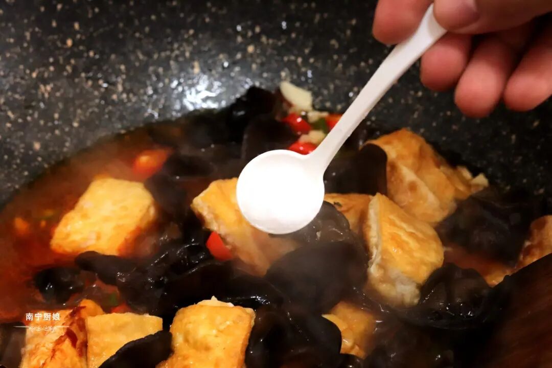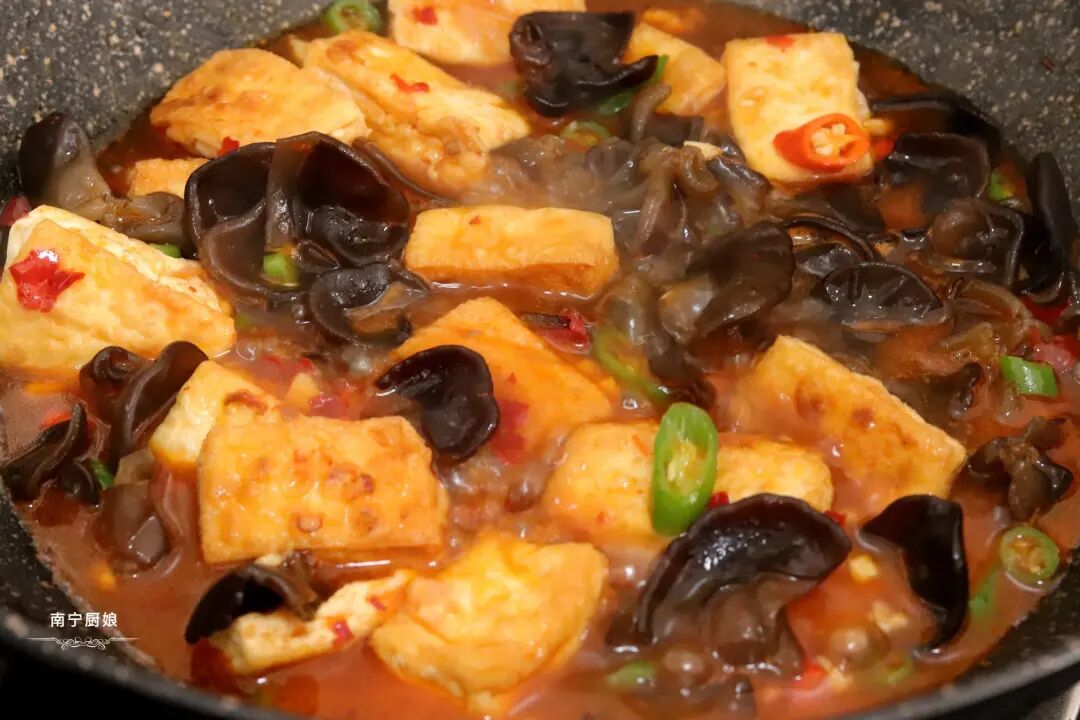 5、放入木耳,再倒入一碗开水烧开,让豆腐烧入味