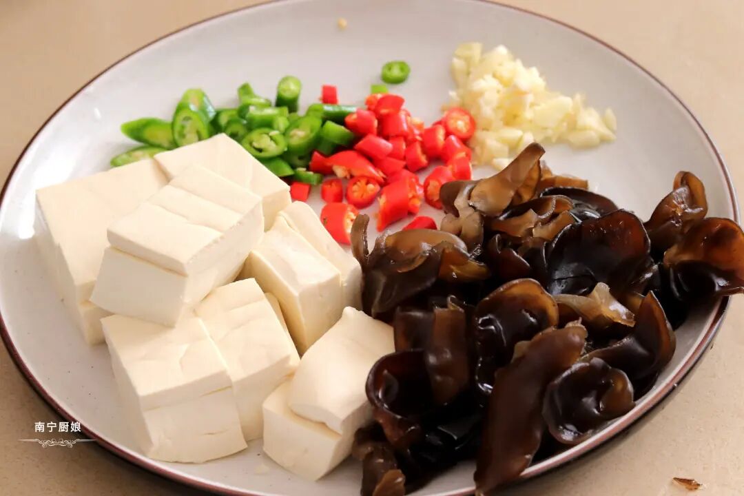 今天买的是卤水点的豆腐,而以往我吃得最多的还是石膏豆腐,卤水豆腐和石膏豆腐比较起来,口感上还是没有石膏豆腐那么嫩滑的,但是很适合煎了后再烧着吃,因为卤水豆腐比石膏豆腐多了一份韧性,煎起来不容易碎掉,而且也容易入味。讲真,今天给我老公烧的这道木耳烧豆腐也是很适合正在减肥的妹子们的哦,因为这道菜的豆腐吃起来很像肉,而且高蛋白低脂肪,吃多了也不怕长肉肉哦!嘿嘿!接下来我们就一起来看下做法吧!