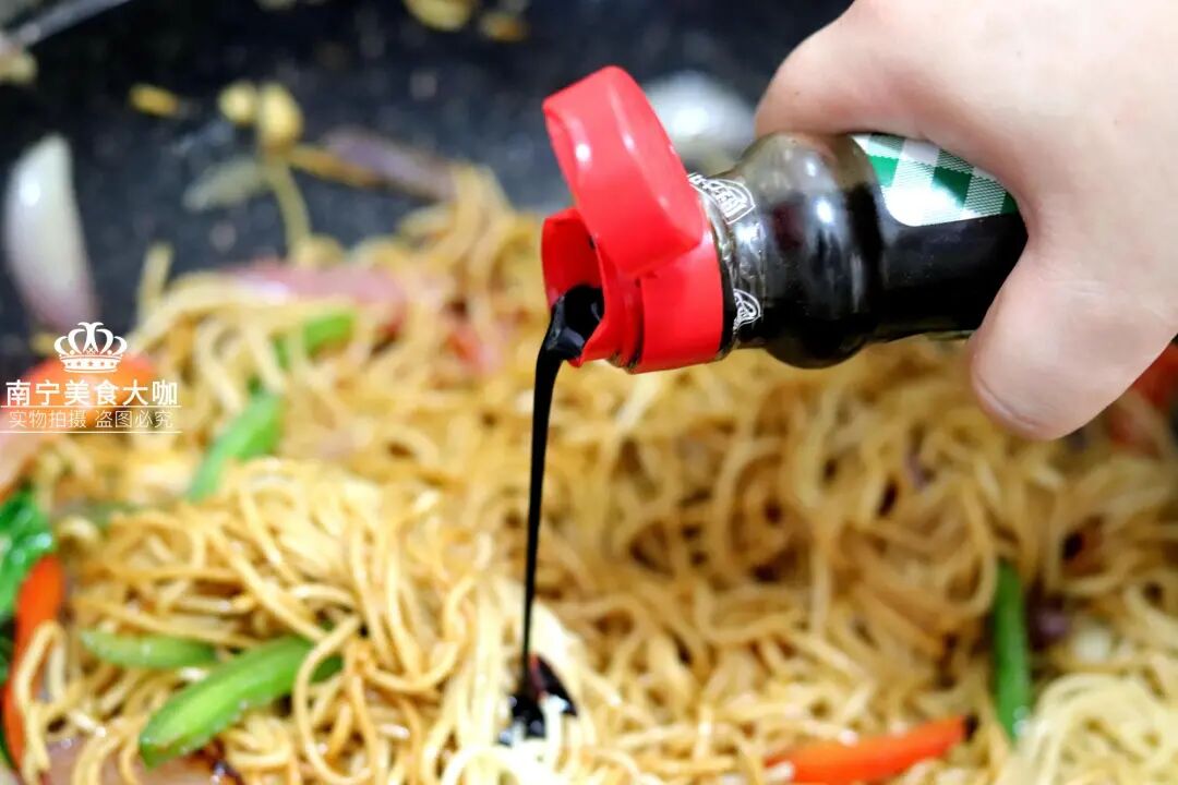 8、把面条和食材一起翻炒均匀后,倒入1勺老抽和一勺食盐调味,翻炒均匀上色