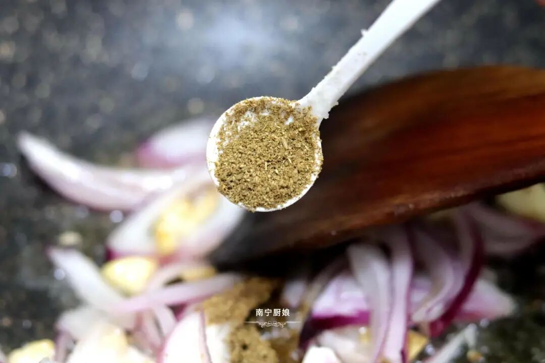 4、把洋葱丝倒进锅里翻炒十几秒,然后放入一小勺孜然粉一起翻炒出香味