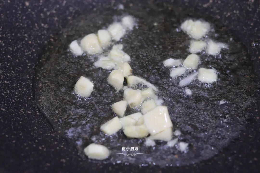 3、重新起锅,在锅里倒入适量的花生油小火烧热,把蒜米倒进去爆香