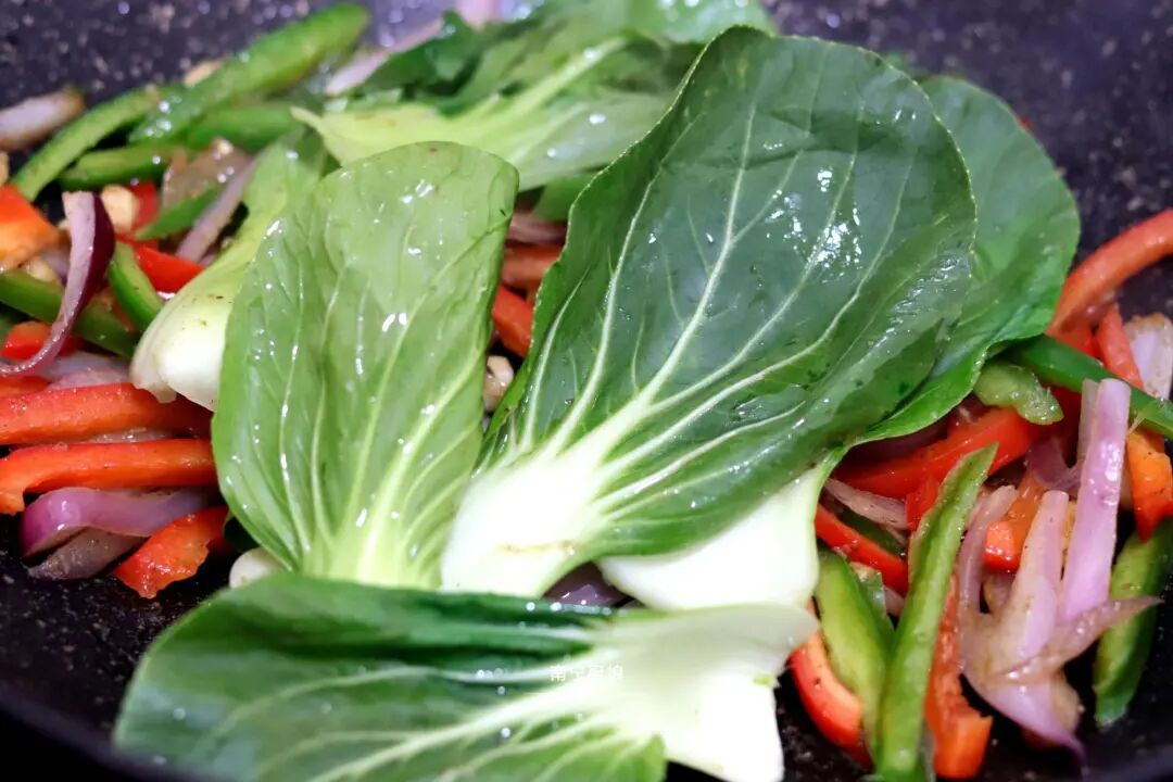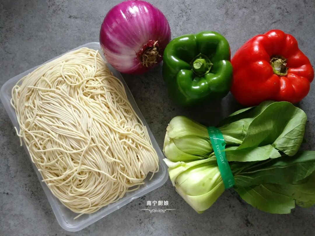 打开冰箱一看,发现有一个洋葱、青红椒各一个、小白菜2小颗,碰巧的是,早上买来的一斤手工面还有一半,那就索性做一盘孜然炒面吃吧,先填饱肚子再等着吃晚饭,嘿嘿!