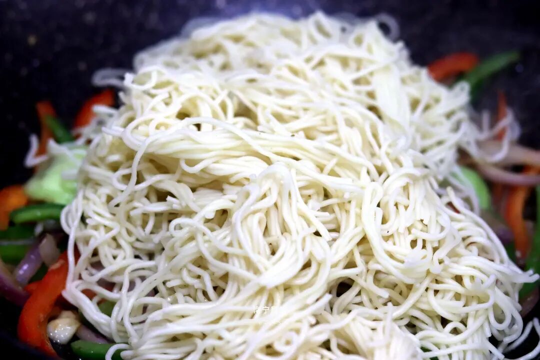 7、把面条也放进去一起翻炒,放进去的时候,要拿起面条抖几下,防止面条打结粘在一起了