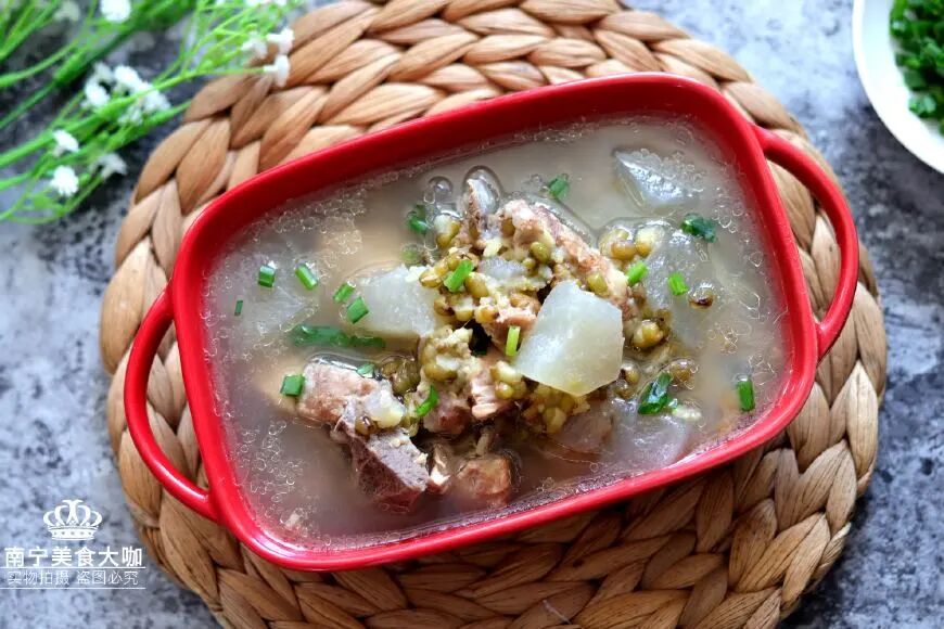 排骨300克、冬瓜小半边、绿豆一把、盐2勺、料酒1勺、生姜1块
