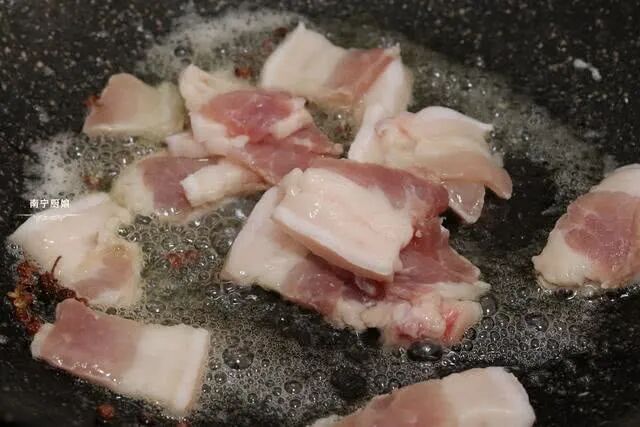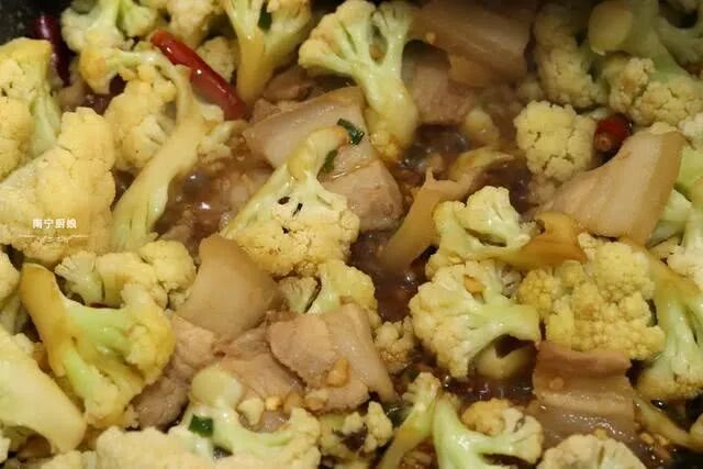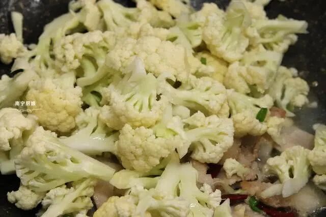 2、一定要把五花肉煸炒出油后再放入花菜一起来炒,一来是让五花肉吃起来不那么油腻,二来是可以让花菜吸收一些五花肉逼出来的香喷喷的油,让花菜吃起来更香。