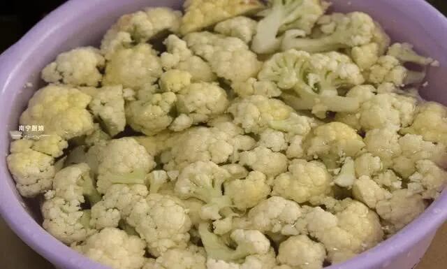 2、花菜掰成小朵后放在盆里放入一勺盐加清水浸泡10分钟以上,然后捞出来沥干待用(用盐水提前浸泡下可以去除农药残留和把菜虫逼出来哦)