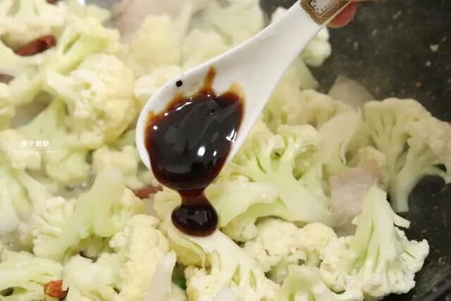 7、放入一勺蚝油、一勺生抽、一勺白砂糖、一勺食盐一起翻炒均匀,如果感觉花菜比较难炒熟,可以盖上锅盖利用汁水把花菜给焖熟,这样也容易让花菜充分的入味