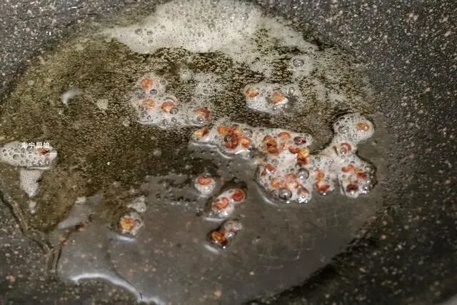 3、冷锅里倒入1勺花生油,再把花椒放进去,然后开小火爆香后把花椒捞出来丢掉