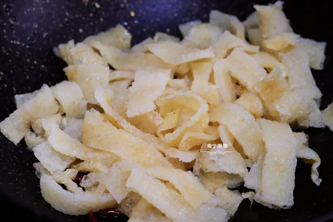 2、把猪皮条倒入一起翻炒均匀,猪皮因为是油炸过的,所以会比较吸油,可以看情况多倒入点食用油。