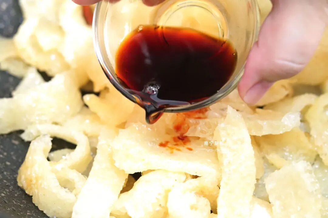4、把猪头皮和生抽翻炒均匀,让猪皮都吸附上生抽。