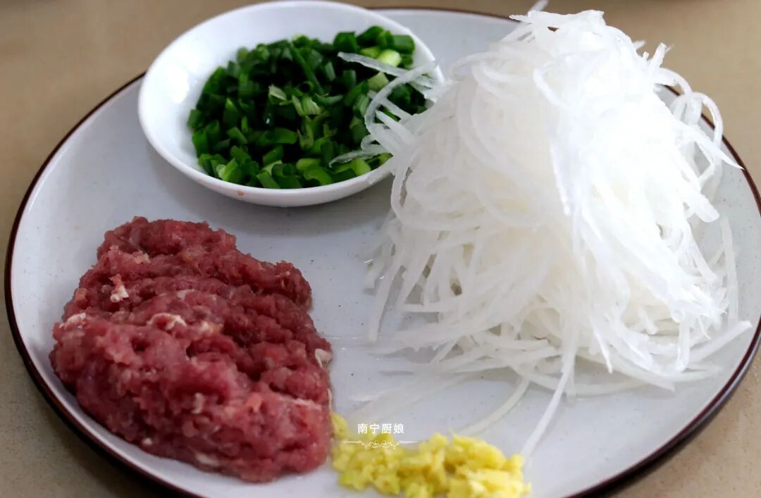 准备好食材:白萝卜半根、水豆腐1块、猪肉馅300克、葱花碎一碟、生姜碎5克