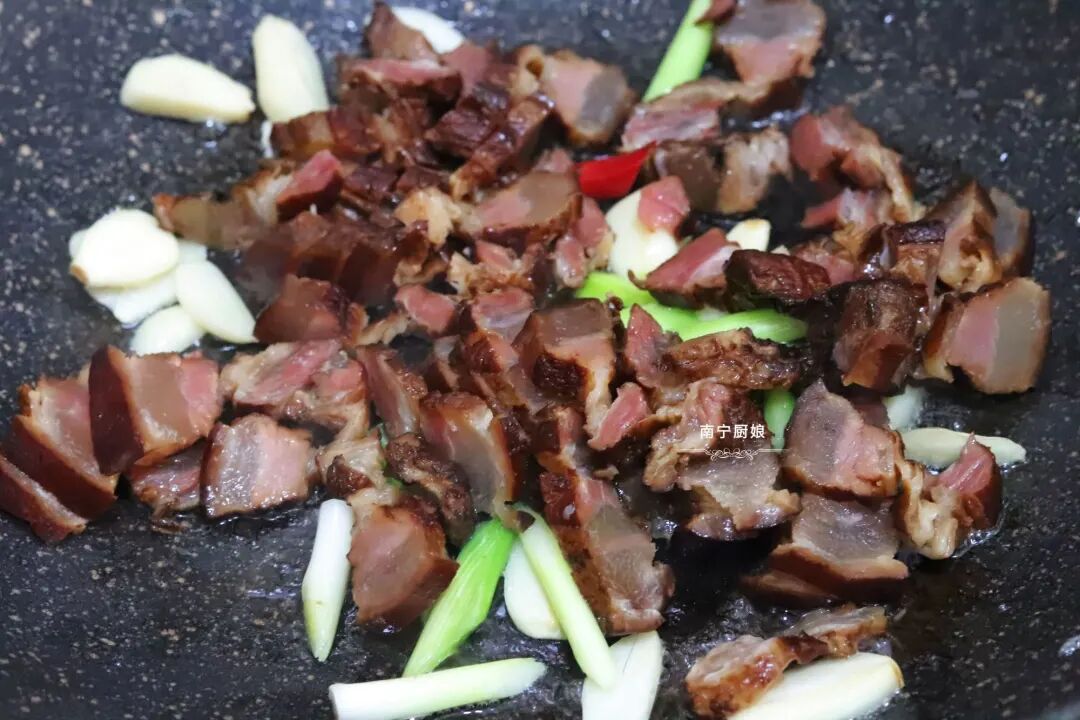 2、起锅,锅中倒入适量油小火烧热,把大蒜和青蒜段倒入爆香,然后把腊肉倒入一起翻炒香。