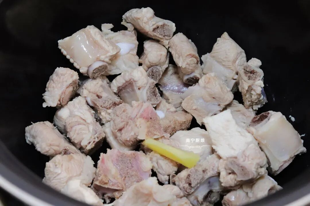 3、把排骨放入高压锅内胆中,再放入一片生姜。