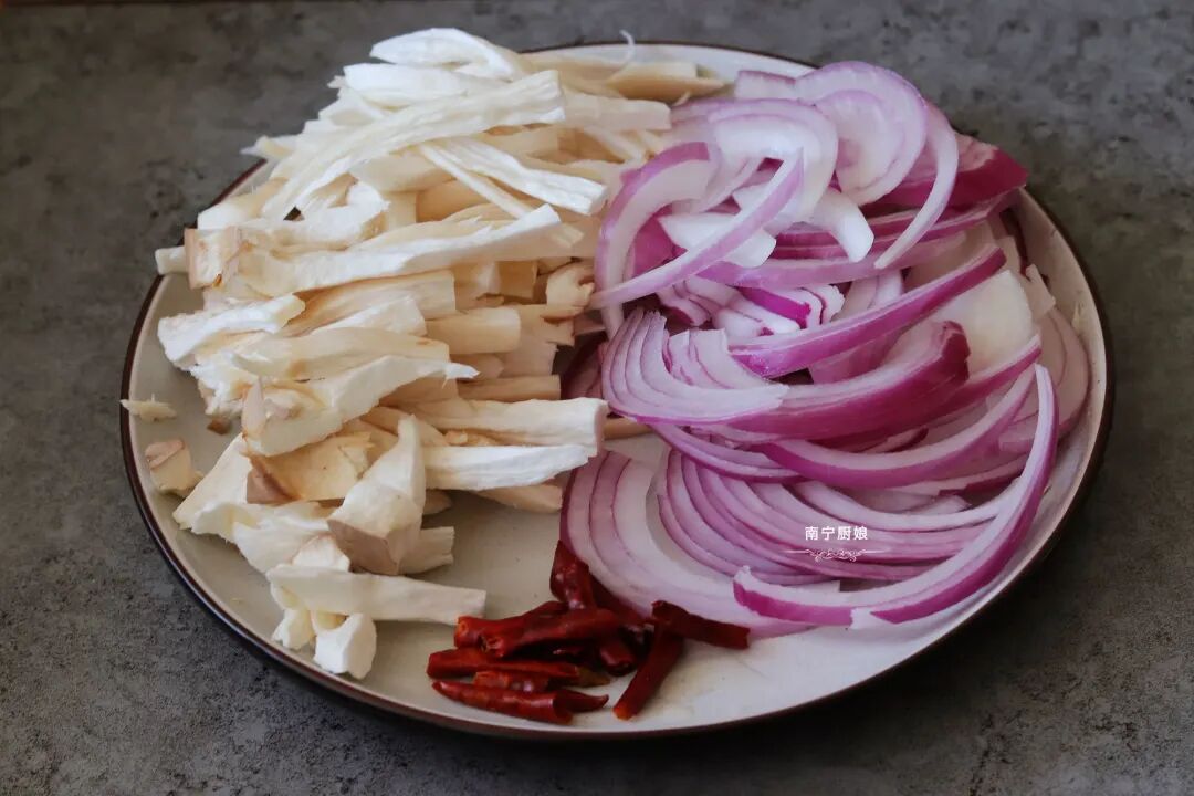 1、把杏鲍菇洗净后切半,再手撕成条,洋葱切半后切成丝,装盘待用(洋葱用半个就可以了,如果你喜欢吃洋葱,放一个也无妨,我只是觉得有点太抢戏了,毕竟主角是杏鲍菇,哈哈)。