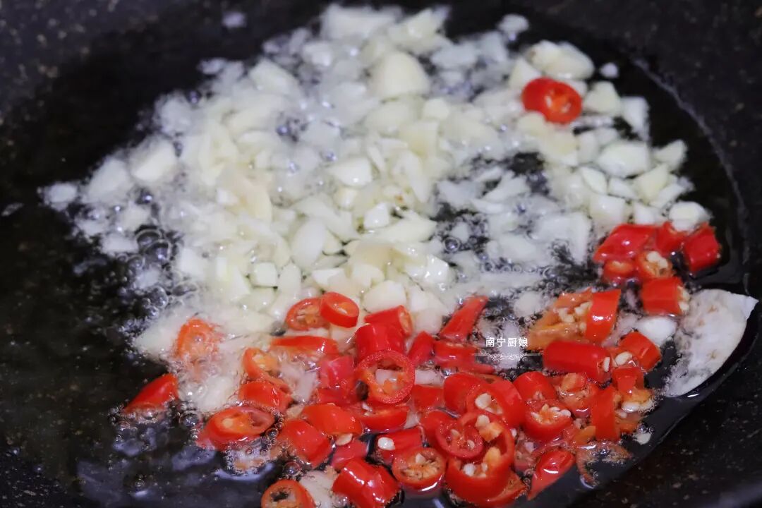 2、起锅少油,倒入比平时做菜多一倍的油,因为茄子比较耗油,小火烧热油后,把大蒜和小红椒倒入爆香。