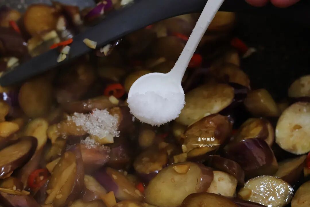 4、分别放入一勺生抽、半勺老抽、半勺白糖、1勺食盐调味,翻炒均匀。