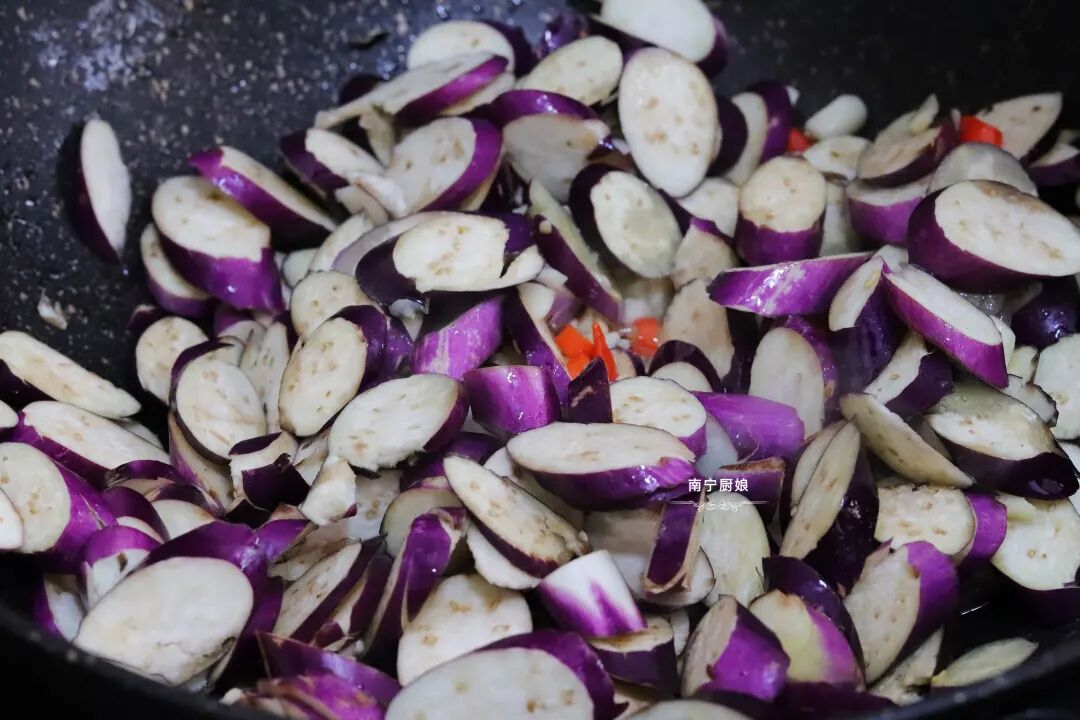 3、把茄子倒入一起翻炒软,茄子皮稍微变色。(如果想保留迷人的紫色茄子外皮,可以放入米醋或者多放点油把茄子炸一遍,我是自己吃的,所以就没有在乎这个颜色了)