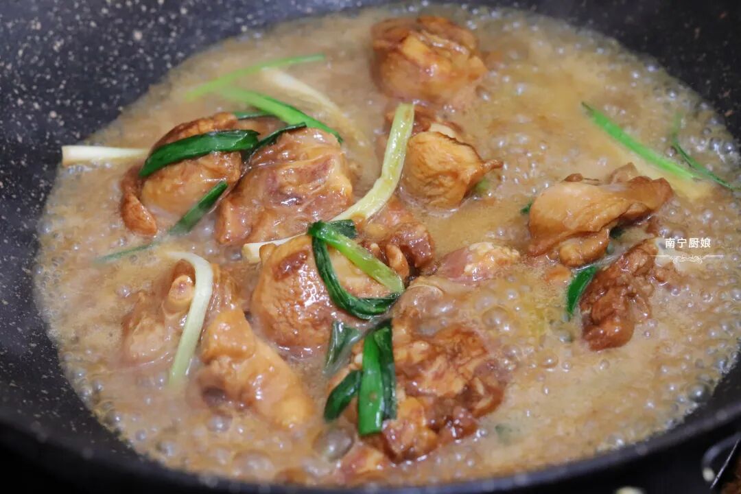 5、大火烧沸锅中的汤汁后,盖上盖子,转小火焖煮15分钟,让鸡腿充分的变熟,也更入味。