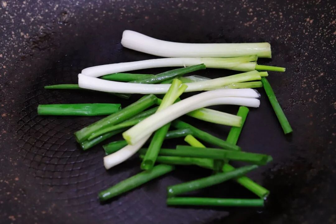 2、起锅。不用急着倒入油,先把葱段放入小火干炒下,好让葱段表面的水分蒸发掉,以免后面倒入油的时候会爆油。