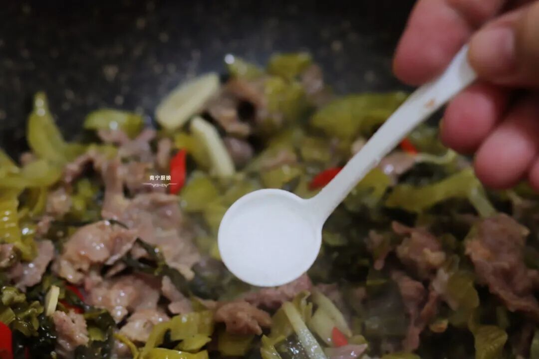 6、因为酸菜本身是用盐腌制出来的,所以自带咸味了,只需要放入一小勺食盐给牛肉调味即可,翻炒均匀。