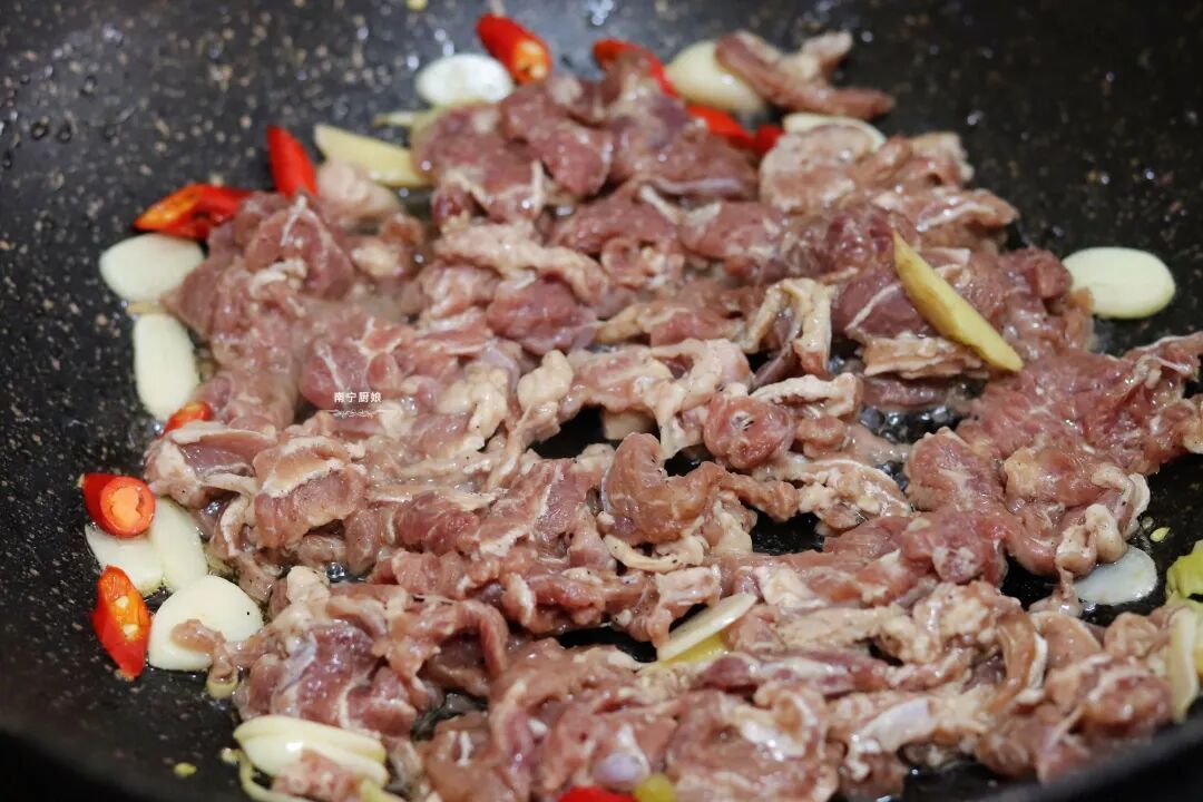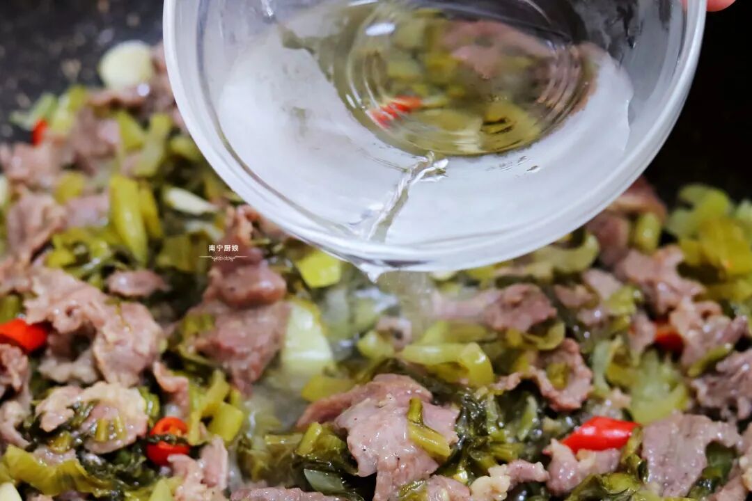 7、再倒入小半碗温水,调大火烧开,然后再调中火,让酸菜和牛肉在锅中稍微煮一下,让酸菜的酸味在汤水的加热中释放出来,而牛肉片在这过程中却可以吸收到酸菜的酸味,从而让食材进行味道的融合,然后再调大火收汁即可出锅。