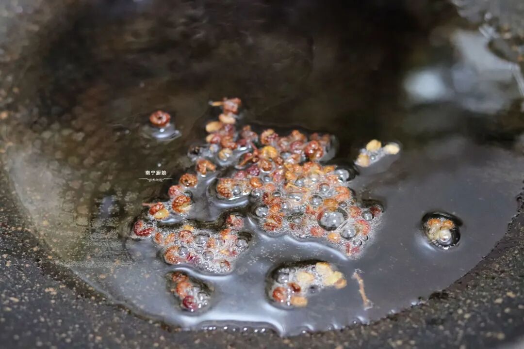 2、起锅小火热锅,然后关火倒入花椒粒爆香,炸出花椒香味后捞出花椒粒丢掉。(热锅冷油才不会把花椒烧糊哦!)