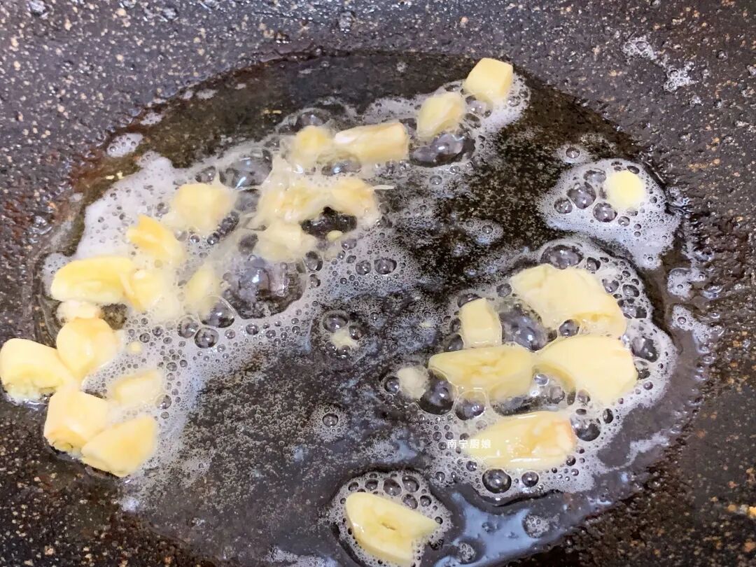 5、把炸鹌鹑蛋的油倒掉,再留点底油,继续烧热,把蒜米倒入爆香。