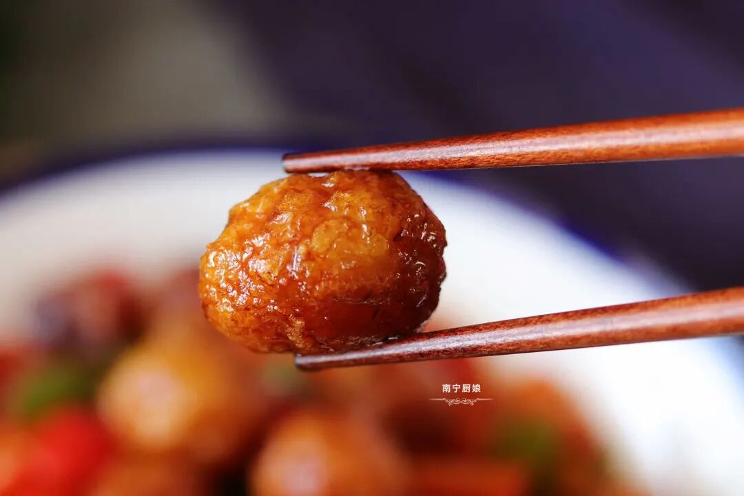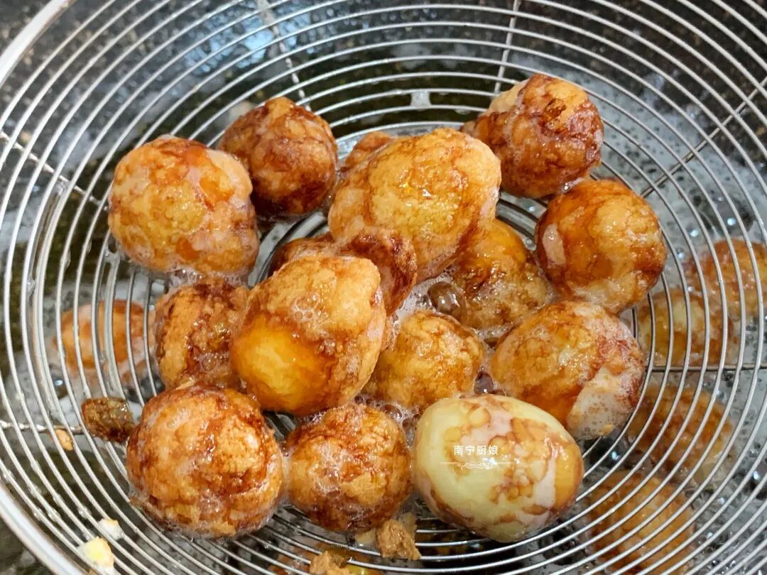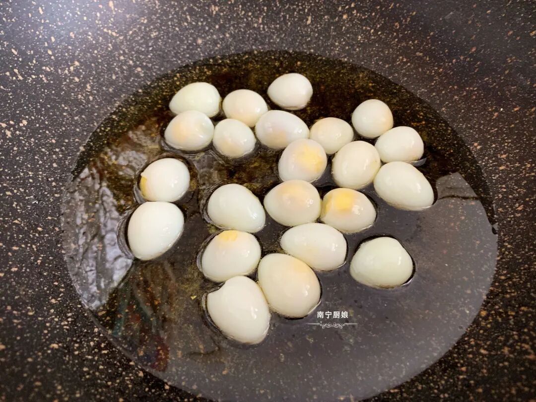 7、再把之前炸过的鹌鹑蛋倒入一起翻炒均匀。