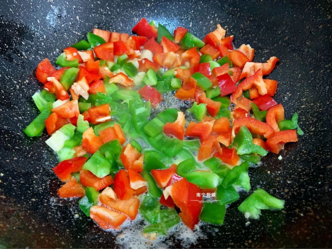 6、把青红椒碎倒入一起翻炒1分钟。
