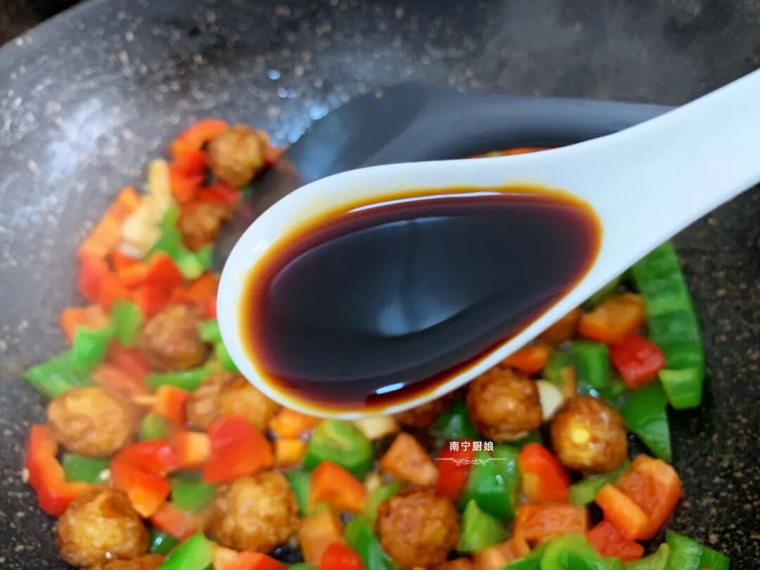 8、放入一勺生抽、一勺蚝油、小半勺白糖调味,翻炒均匀。