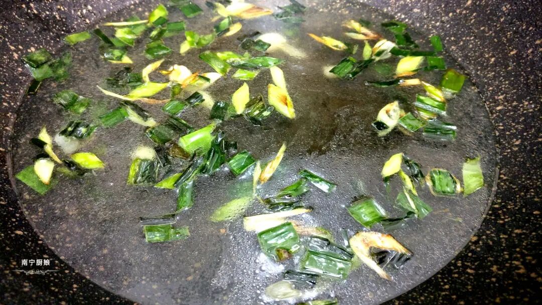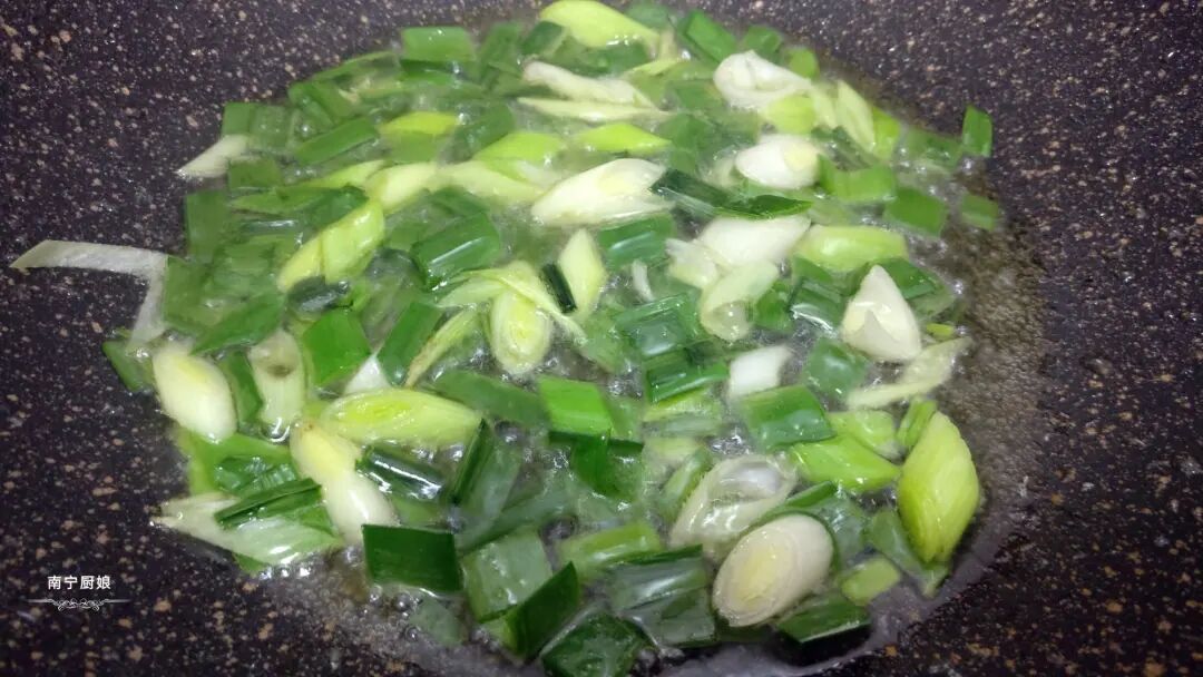 3、起锅,在锅里倒入适量的油,把青蒜段倒进去煸炒香,青蒜段香味随着油的温度升高,青蒜的香味逐渐被逼出来了,又融入到了油里