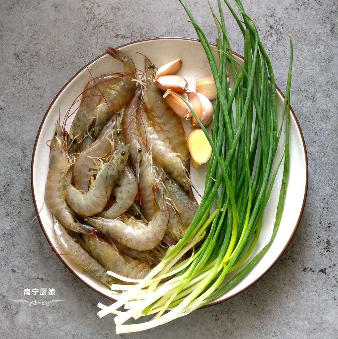 准备好食材:鲜虾500克、葱花3把、蒜米4粒、生姜1块、食盐1勺、白糖1勺、料酒1勺、淀粉一勺、清水3勺