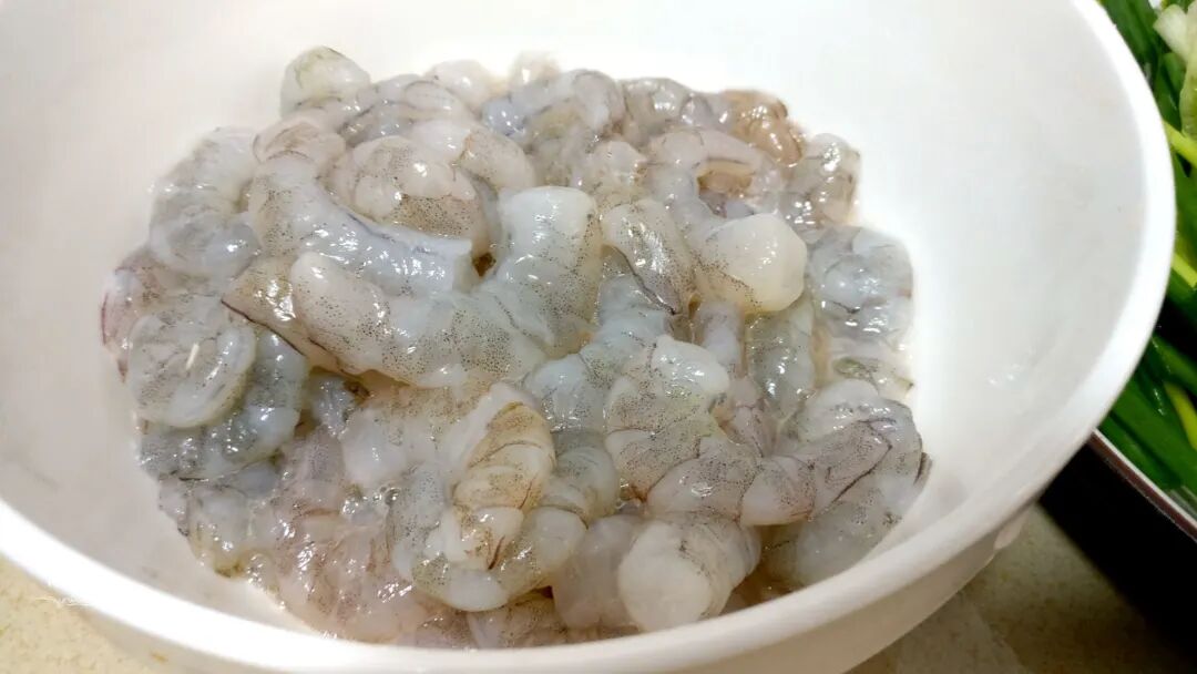 1、把鲜虾去去壳去虾线后放在碗里,放入一勺淀粉和一勺食盐,然后用手慢慢擦洗,然后放到水龙头下冲洗干净,再放进碗里,倒入5克淀粉和小半勺食盐搅拌均匀腌制5分钟