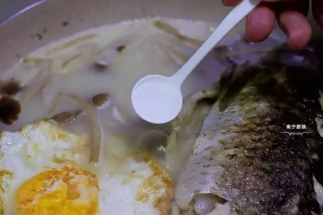 4、把之前煎好的煎蛋也放入锅中,再倒入没过鱼身一半的热水,继续开中火煮沸鱼汤,大约煮个10分钟,鱼汤就慢慢变成奶白了,非常的诱人。(热水最好一次性加个够,不用担心汤水太多,因为在煮的过程中,还会蒸发一部分的,如果之前加水不够,中途再加水,不仅汤水不鲜美,原本的奶白色也被冲淡了)