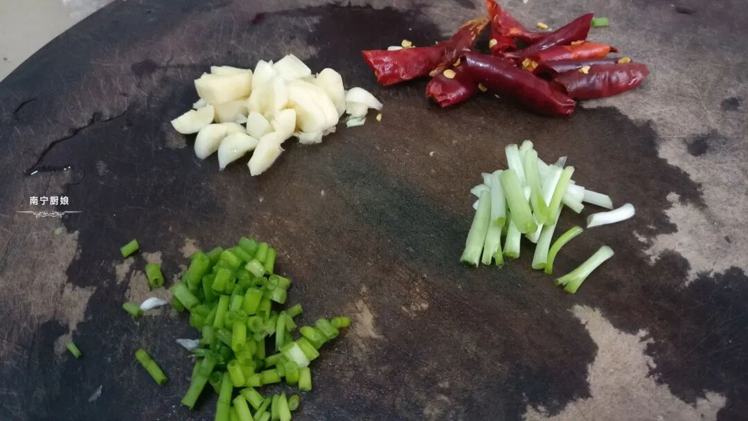 1、葱花洗净后切碎、蒜米去皮后切碎、干辣椒切段