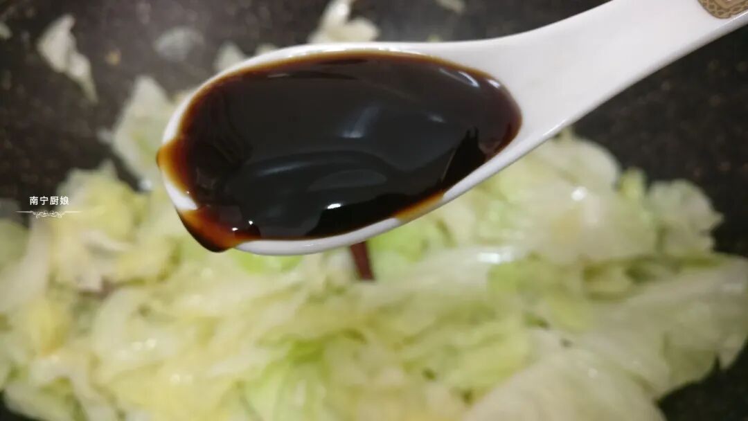 6、把包菜也倒进去一起翻炒软,翻炒过程中包菜会出水哦,所以不用加水