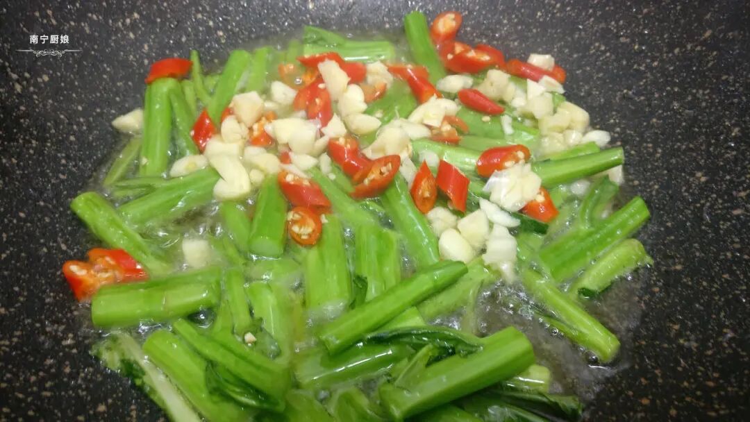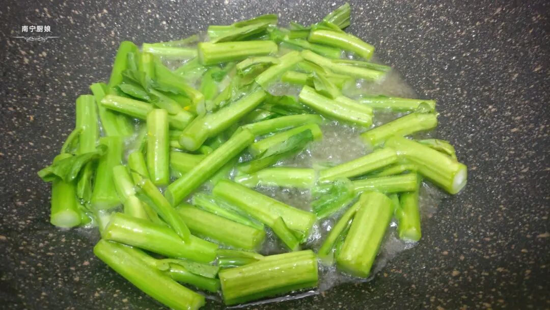3、起锅,在锅里倒入多一点的花生油(菜心都一点油炒起来才好吃)小火烧热后先把菜根部分倒进去翻炒软