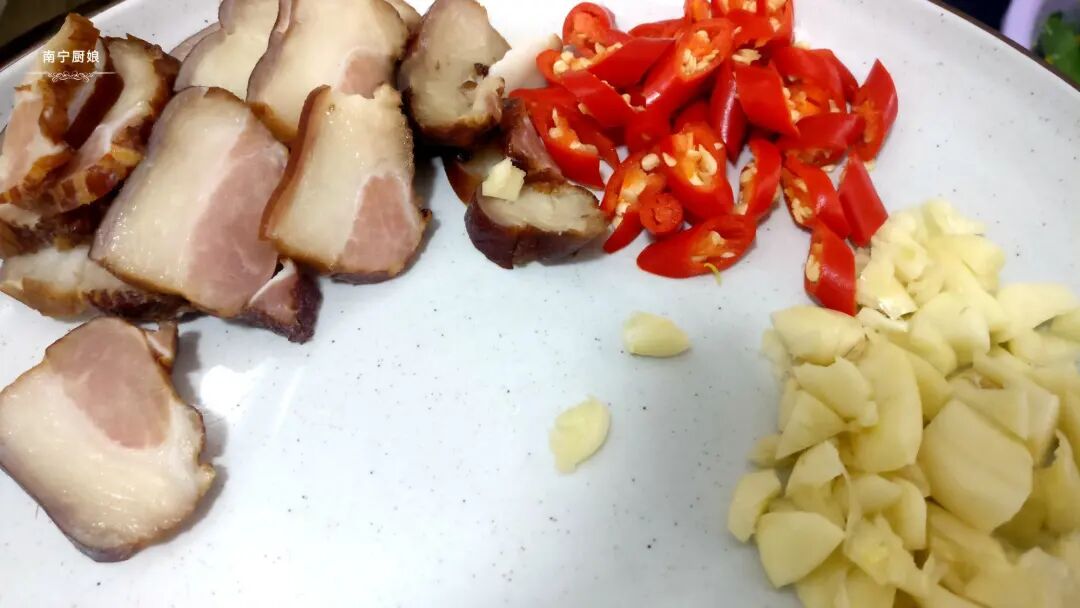 1、把腊肉洗净后切成块,小红椒洗净后切斜刀,蒜米去皮后切碎