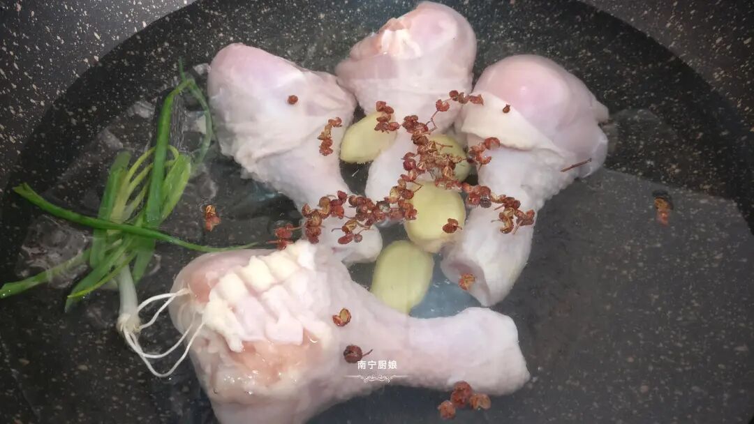 1、把鸡腿冷水下锅,放入葱节、生姜片和花椒一起开火烧煮10分钟