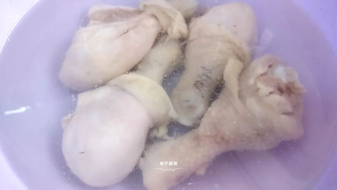2、鸡腿烧煮好后捞出来放在冷水里浸泡凉,然后拿到水龙头下冲洗掉浮沫沥干待用