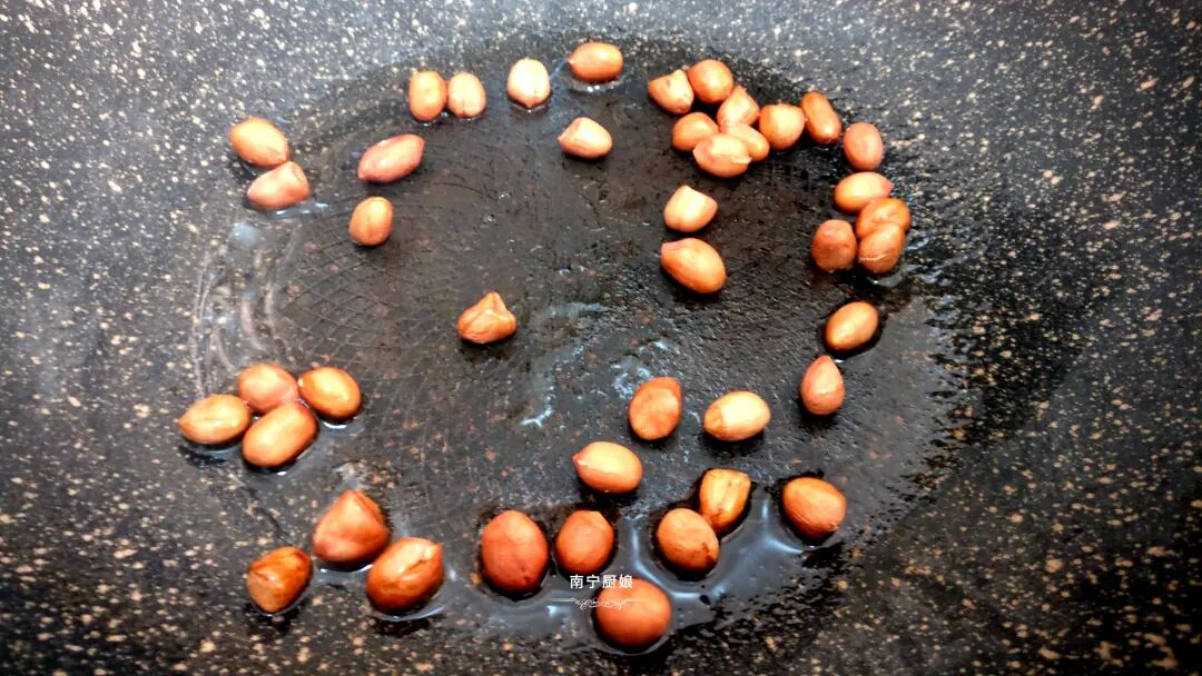 3、起锅,冷锅冷油放入花生米,开小火把花生炒香然后装进保鲜袋里,用刀背拍碎