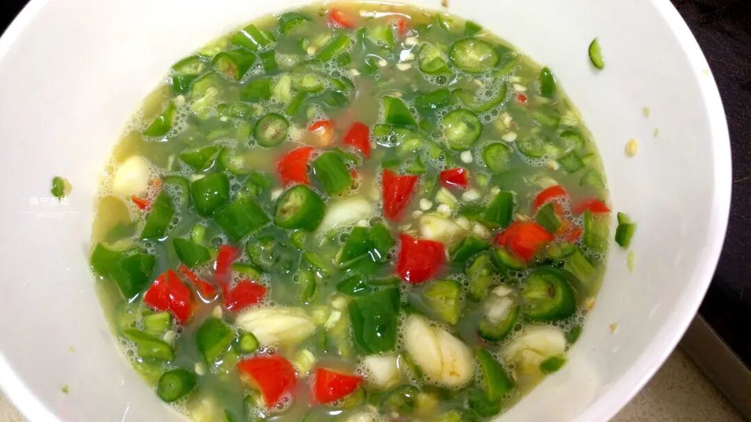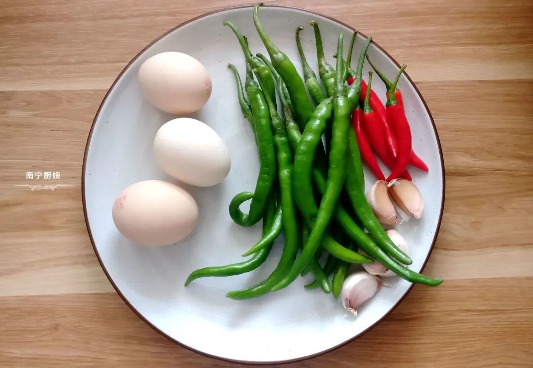 准备好食材:鸡蛋3颗、绿尖椒200克、小红椒6颗、蒜米4粒、味极鲜1勺