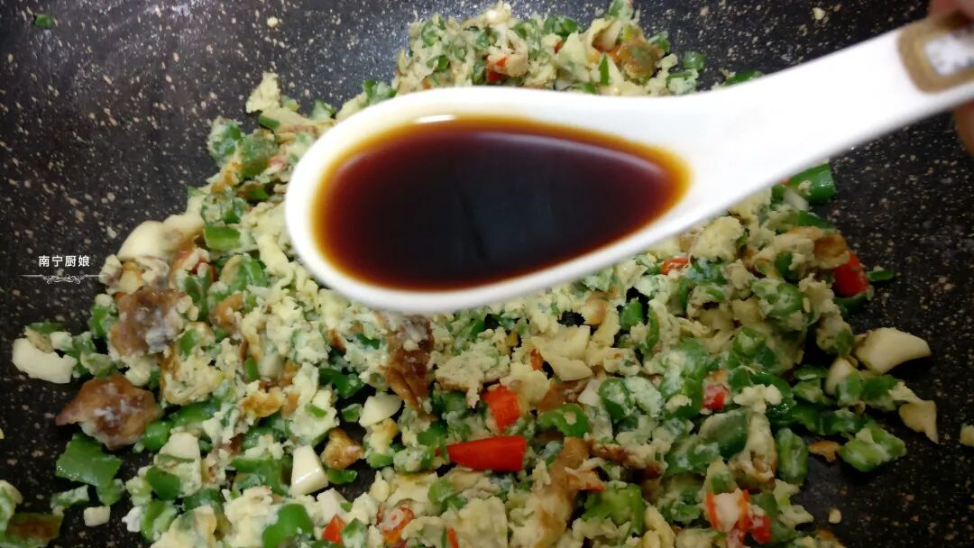 5、把鸡蛋翻炒碎后,放入一勺味极鲜即可出锅