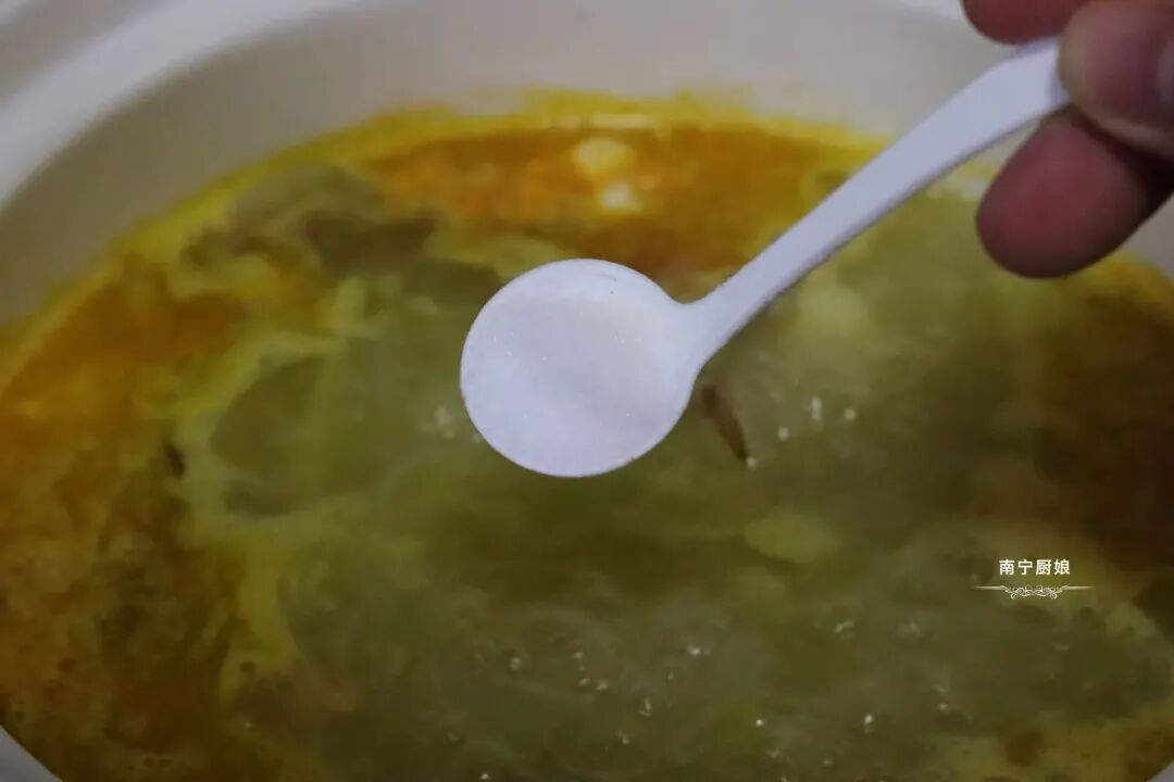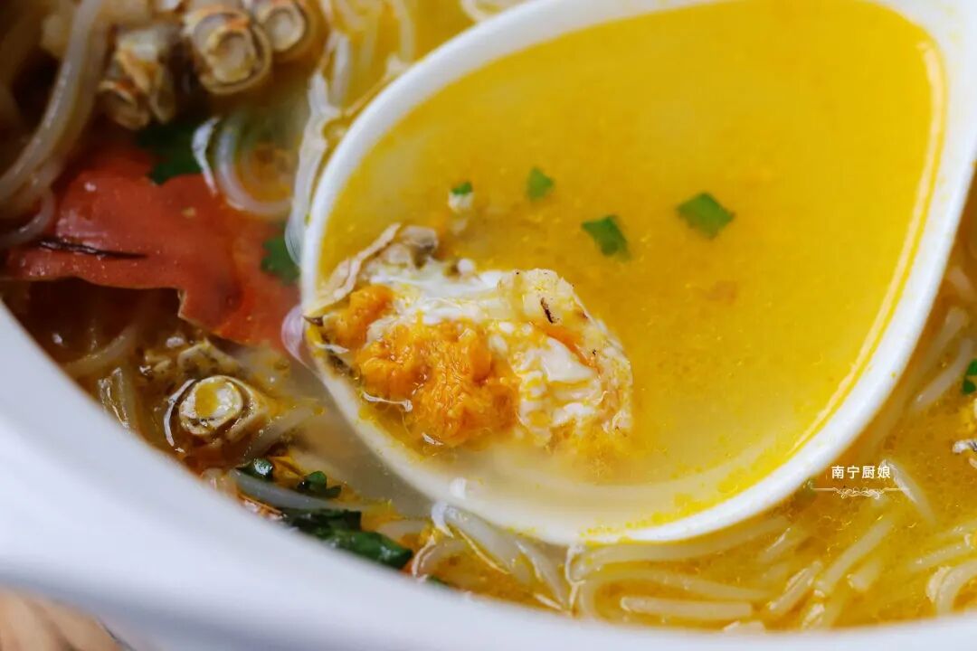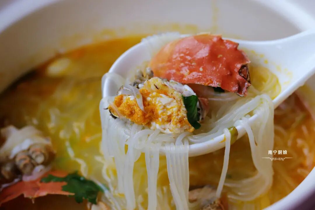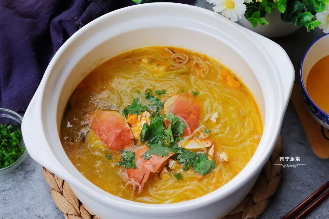 9、随着汤水的不停翻滚,大闸蟹的鲜味和蟹黄不断的融入到汤水中,汤水变得越来越鲜香金黄,粉丝也充分的吸收了汁水,变得根根饱满细滑。出锅之前再放入食盐调味,即可出锅。