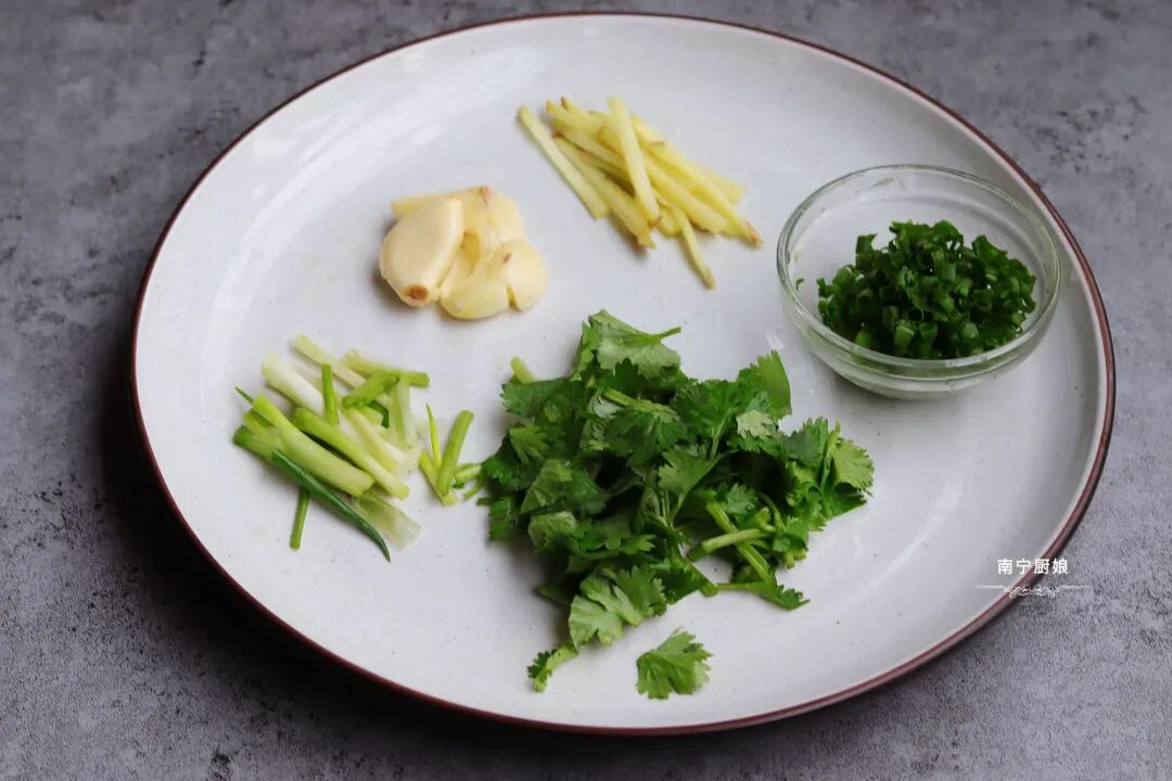 1、把香菜洗净后切碎,生姜切丝,大蒜用刀背拍裂去皮,香菜洗净把葱白切段,葱绿切碎。