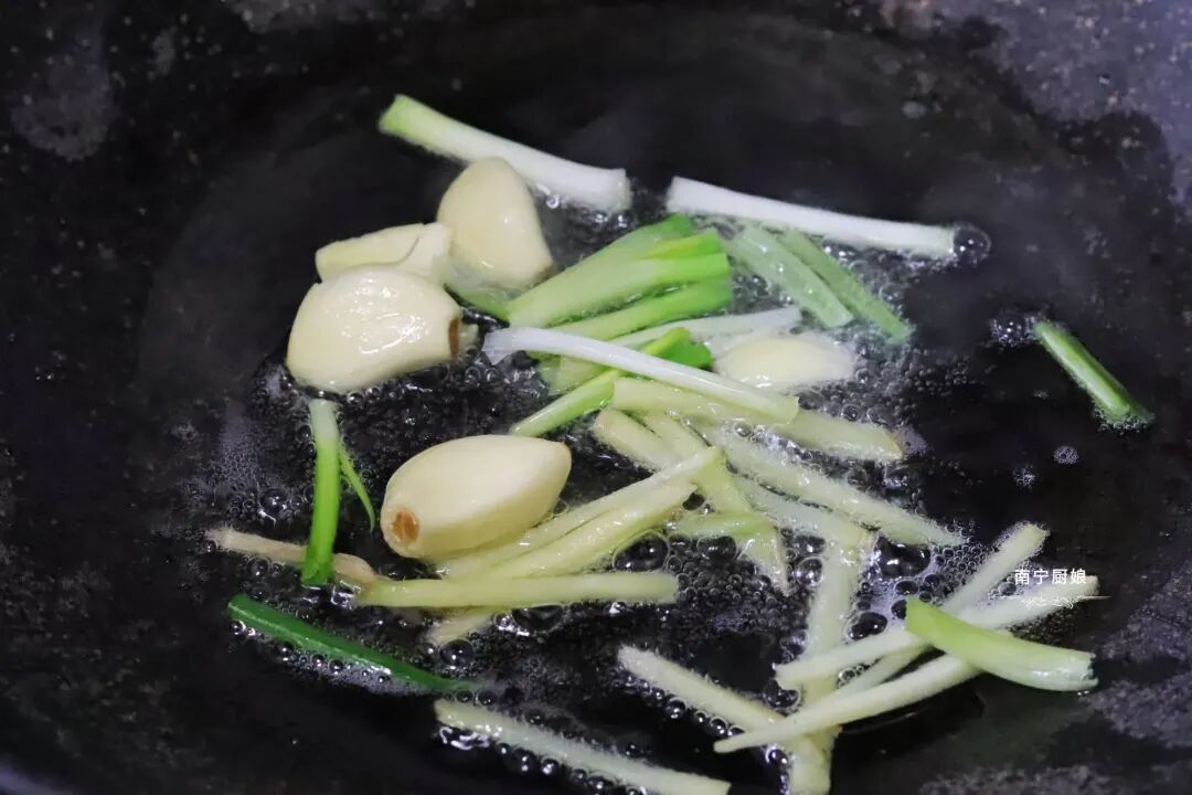 5、起锅,倒入适量的油小火烧热,把葱姜蒜倒入爆香。