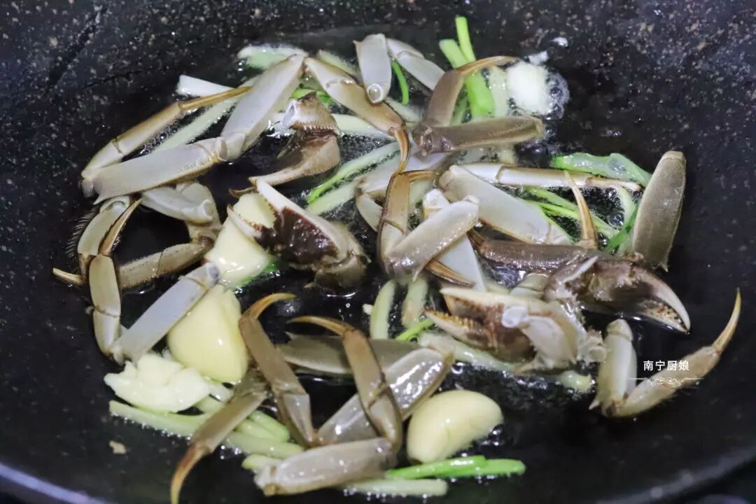 6、把蟹脚倒入炒香,炒至外壳变红。