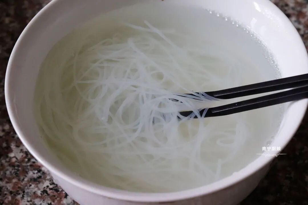 4、烧热一锅水,把细粉丝放入大碗中,倒入热水泡软后捞出。